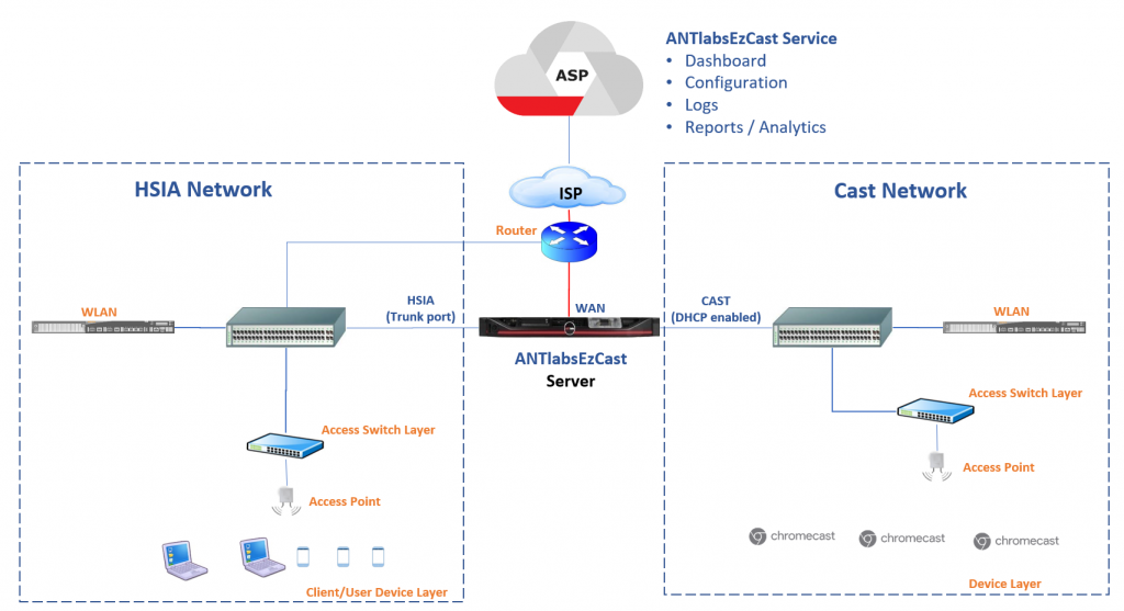 ANTlabsEzCast delivers a cost-effective standalone solution with cloud management and on-premise gateway control. When paired with ANTlabs gateways’ onboard Advanced QoS and application-shaping technologies, hotels can be assured that the surfing speeds do not degrade significantly with the additional streaming internet traffic. Furthermore, it offers a superior technical advantage by eliminating multicast traffic overhead. This is achieved by creating a private network between the end-user’s devices and associated Chromecast devices.